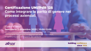 AFNOR Italia ha recentemente organizzato il seminario online “Certificazione UNI/PdR 125: integrare la parità di genere nei processi aziendali”, dedicato all’approfondimento della prassi nazionale per la certificazione della parità di genere e alla comprensione di come promuovere e monitorare politiche e sistemi organizzativi inclusivi. L’evento, tenutosi martedì 2 dicembre 2025 dalle ore 10:00 alle 12:30, ha visto la partecipazione di numerosi professionisti, tra Responsabili delle